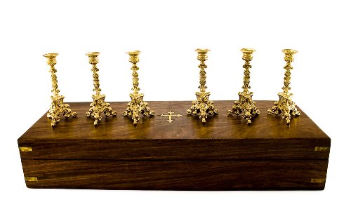 Our Traveling Candle Service Set is designed for easy portability where service is needed Lavished with with 22k Gold Plate in a hardwood case and fitted lining you simply will not find a more suitable set when on the goOur Traveling Candle Service Sets are religious church supplies for use by